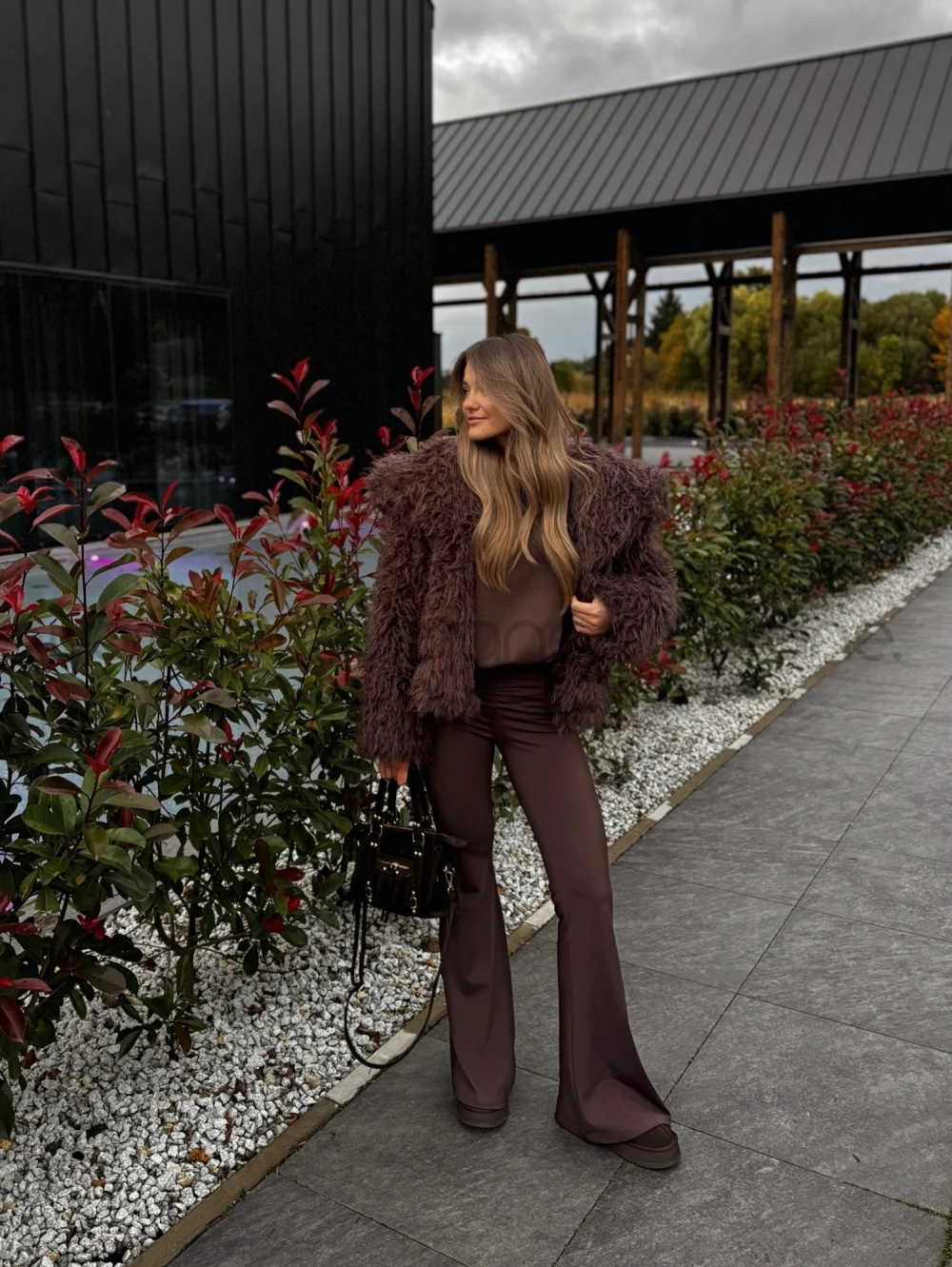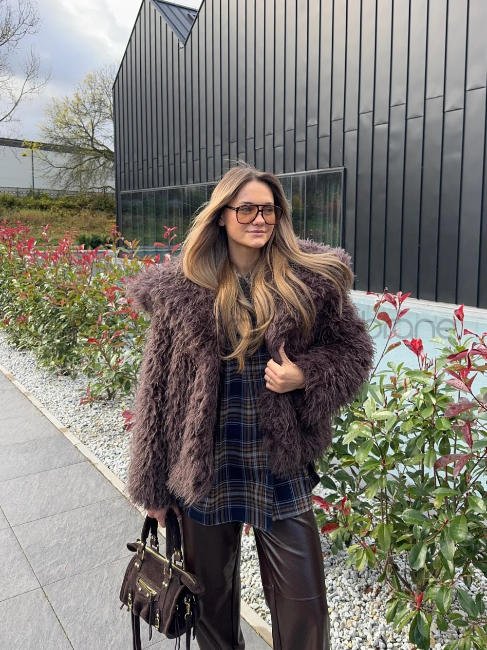 Czekoladowe futerko z dużym kołnierzem to stylowa i przytulna propozycja na chłodniejsze dni. Wykonane z miękkiego, puszystego materiału o głębokim, czekoladowym odcieniu, dodaje elegancji i ciepła każdej stylizacji.