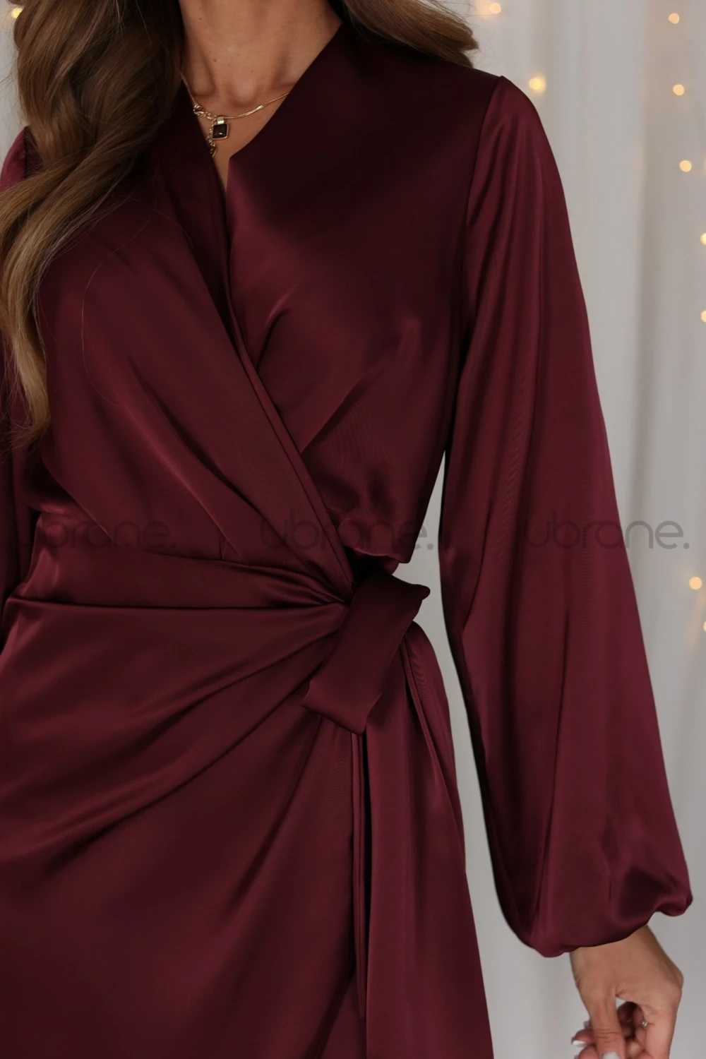 Elegancka sukienka o kopertowym kroju, wykonana z gładkiego, lekko połyskującego materiału. Model posiada długie rękawy zakończone delikatnie gumką, dzięki czemu tworzą subtelne marszczenie przy nadgarstku. W talii znajduje się wiązanie, które podkreśla sylwetkę i dodaje całości kobiecego charakteru. Sukienka ma kopertowy fason. Idealny zarówno na eleganckie wyjścia jak i bardziej formalnie okazje.